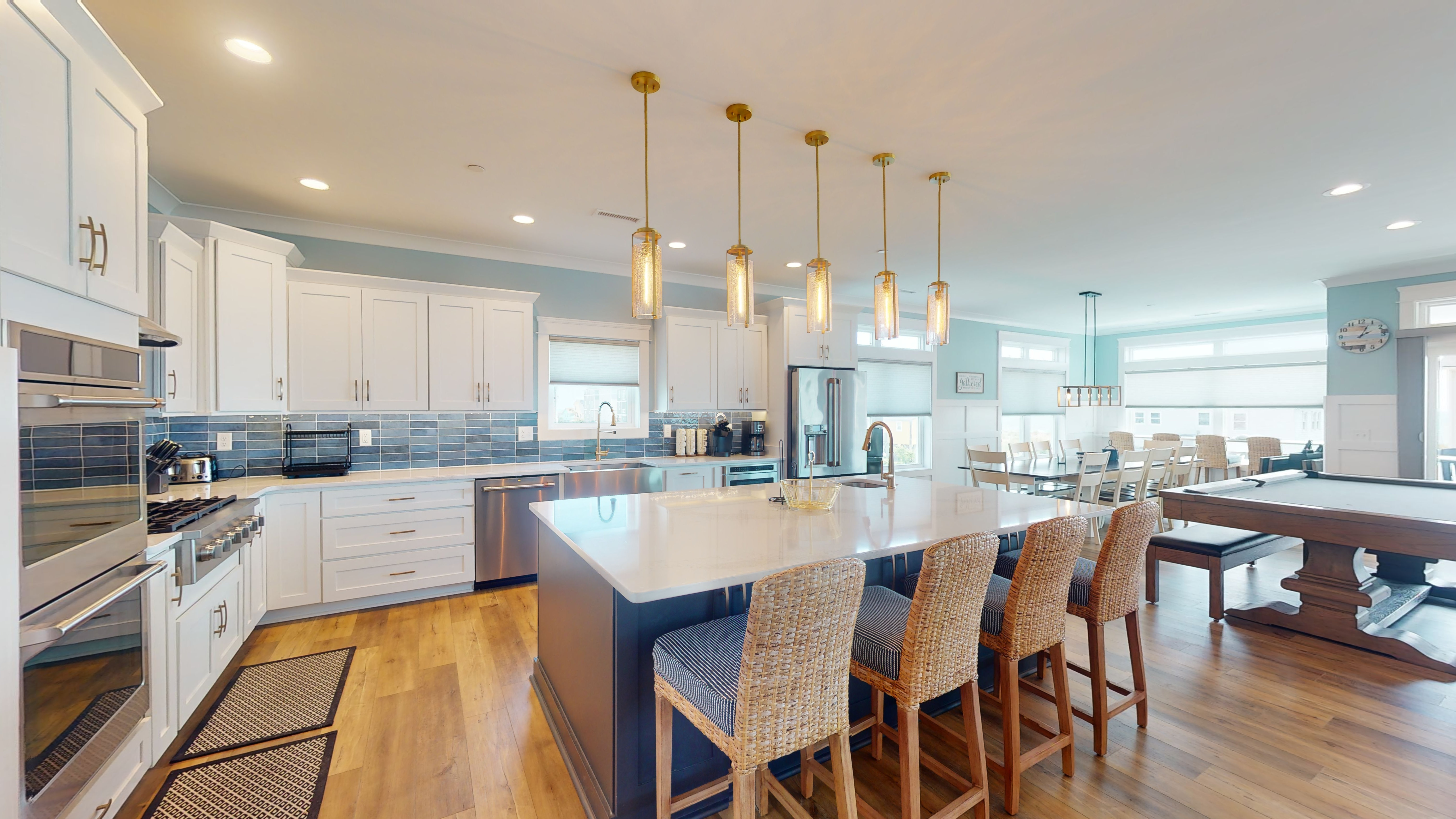 Comfortably cook and entertain in the gourmet chef’s kitchen equipped with two refrigerators, a professional gourmet gas stove and double oven.